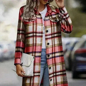 Red Elegant Women's Plaid Long Sleeve Button Up Flannel Shirt Shacket