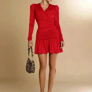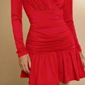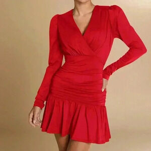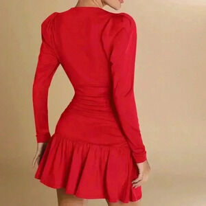 Red Elegant Women's Solid Deep V-Neck Long Sleeve Ruched Ruffle Hem Mini Dress