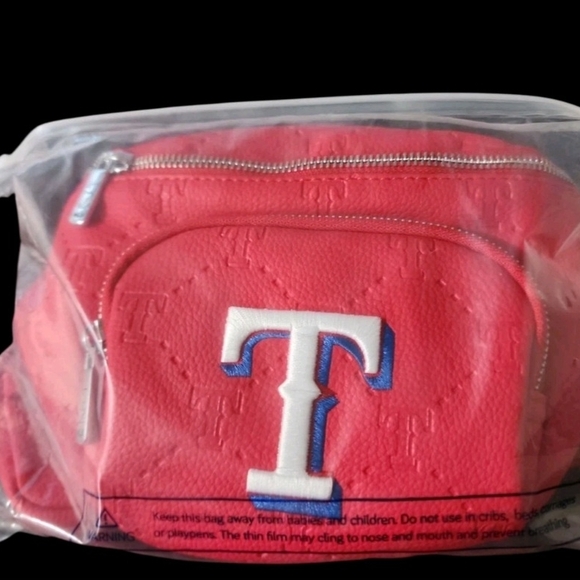 Stylish red pouch with embossed logo. Features a front zipper pocket.