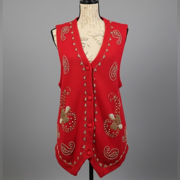 A bright red knit cardigan vest featuring gold-tone beadwork and paisley embroidery. Donnkenny was a prominent American sportswear label that gained popularity in the mid-20th century for creating accessible, stylish coordinated separates for women. During the 1980s and 1990s, the brand became well-known for its embellished 'novelty' sweaters and vests, which often featured intricate beadwork, sequins, and embroidery. These pieces became staples of the era's holiday and office fashion and have since gained a second life as 'ugly Christmas sweaters' or kitschy retro collectibles.
