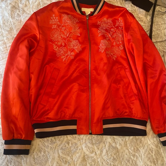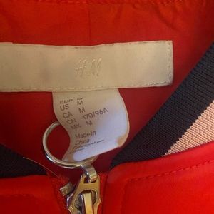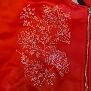 Red Jacket from H&M only worn once in basically brand new condition. It has light pink floral embroidery on both sides of the chest.