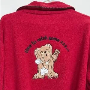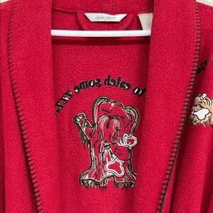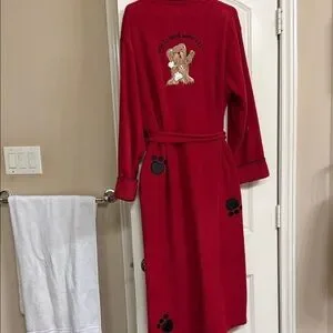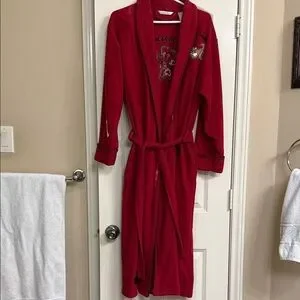Luxurious red robe with intricate embroidery. Features a comfortable tie belt and long sleeves.