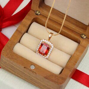 This elegant pendant features a radiant red emerald-cut stone surrounded by shimmering crystals, set in a classic rose gold frame for timeless beauty.