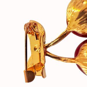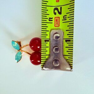 Red Enamel Cherry Brooch Pin Green Acrylic Gem Gold Tone Metal