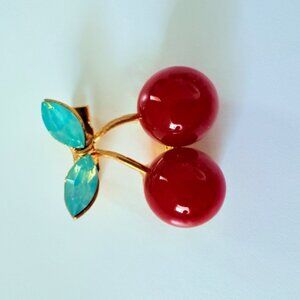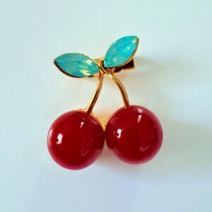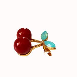 A delightful brooch that tells the story of summer's sweetness, showcasing vibrant red cherries and glistening green leaves. A timeless accessory for charm.