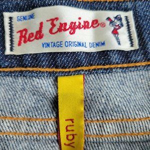 Red Engine Ruby Jeans Size 28. These jeans were made to look Distressed with coloring of jeans and made to look worn. They are very stonewashed in places and see picture of how the distressing looks on the back of the legs. They came frayed at the bottom and there are some areas that are slightly brown (see pictures)