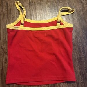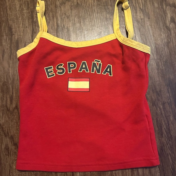 Stylish red tank top with España print. Features yellow trim and straps.