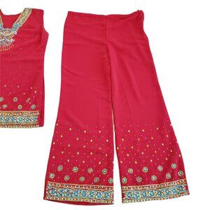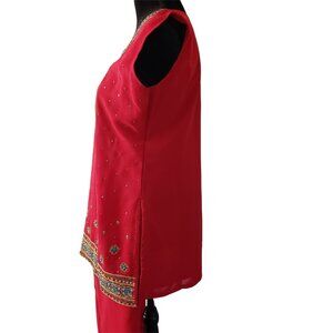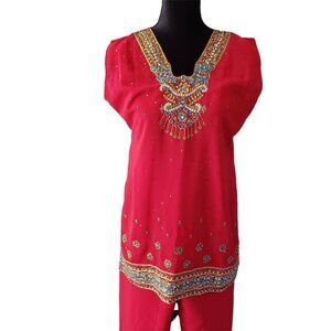 Red Ethnic Indian Tunic Top & Wide-Leg Pants Set Intricate Embroidery & Beading