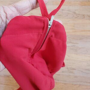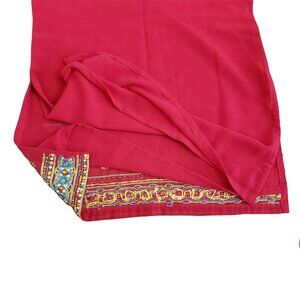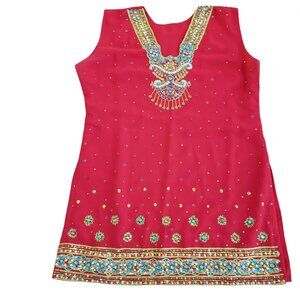 This women's ethnic Indian outfit features a vibrant red color with detailed beadwork and embroidery, offering an elegant yet comfortable lightweight ensemble.