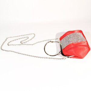 Make a striking statement at your next event with this exquisite red evening clutch. Its vibrant hue is beautifully accented by a dazzling rhinestone stripe that catches the light with every movement. The elegant silver-tone metal handle adds a touch of sophistication, making it the perfect accessory to complement your ensemble and hold all your essentials in style.