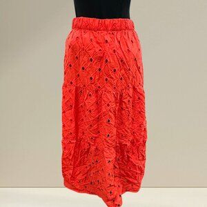 Bring bold color and boho charm to your wardrobe with this vibrant red eyelet maxi skirt. The lightweight cotton fabric features an intricate cutout design and a flowy, tiered silhouette that moves beautifully. Perfect for pairing with a simple tank or denim jacket for an effortlessly chic look.