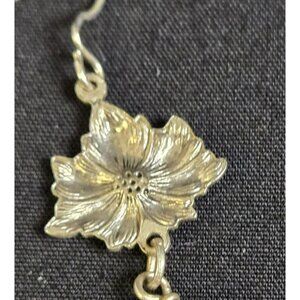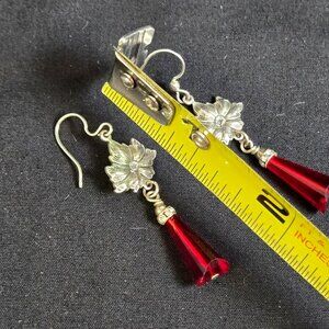 Beautiful pair of silver-tone dangle earrings featuring a floral top with a tiny clear rhinestone and a bold red faceted glass-look cone drop. The sculpted flower detail adds a romantic, vintage-inspired touch, while the translucent red glass catches light from every angle.