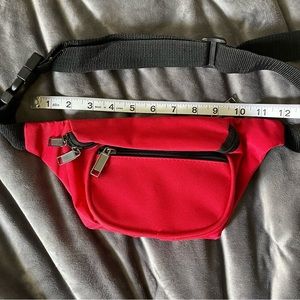 Red and black Fanny pack. 2 zippered pockets and adjustable strap.