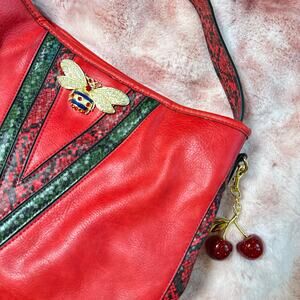 Unbranded but undeniably iconic, this red faux leather hobo bag features a bee embellishment, cherry charm accents, and embroidered green & black trim.