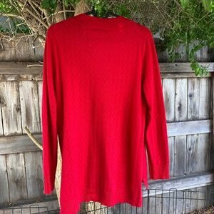 Cable & Gauge vibrant red fine knit V-neck sweater in excellent condition size Medium. Care instructions were removed but I am pretty sure this is a cotton blend and I wash delicate / hang dry with no issue. Breathable weave makes this great for layering or mild weather. Light weight knit makes it versatile to tuck in, add belt or leave out. 19 inches pit to pit and 25 inches in length #winterknits #sweaterweather