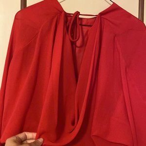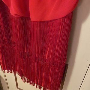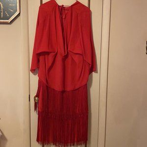 Red long-sleeved flapper dress with cowl back and ribbon tie. Two-layered fringe hemline. Made in the USA. 100% polyester. No size tag but looks to be XL. Brand: Simon Sez.
