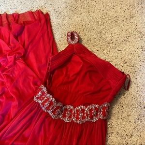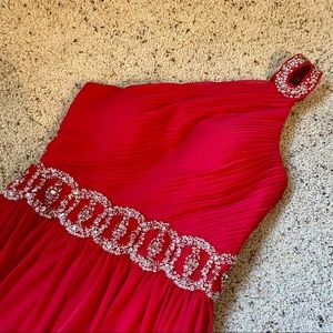 Red one shoulder, open back, floor length gown. Built in pads. Beautiful details on waist and shoulder. Never altered. Worn once. From a smoke and pet free home.
