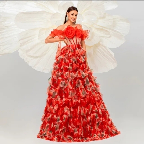 Red, Floral, Applique, Corset Waist, Ruffled Ball Gown for Special Events