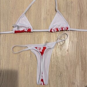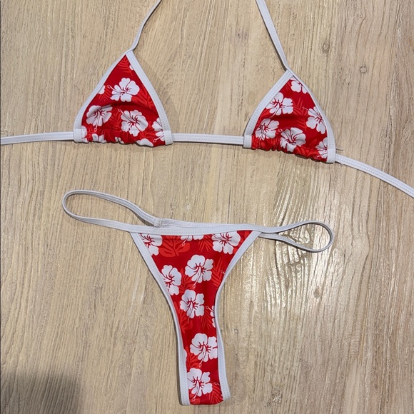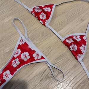 Stylish red bikini set with white floral pattern. Perfect for the beach.