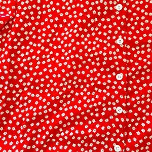 red floral blouse, cottage core, button-up shirt, vintage-inspired, polyester blouse, floral print, casual wear, retro style, bright red, white flowers, comfortable fit