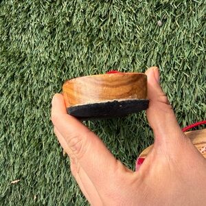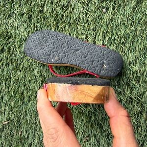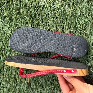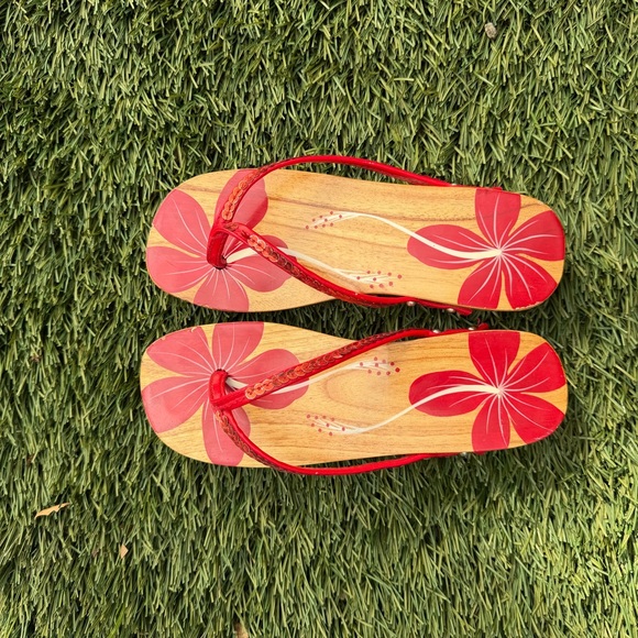 Stylish flip flops with red floral design. Perfect for casual wear. Made out of wood and some sequins are missing