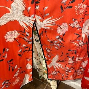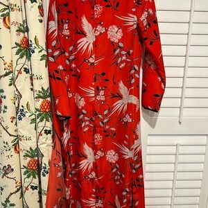 Red kimono robe with floral and crane design. Size medium. Very good used condition. Worn 1-2 times. Has snaps to close at the front or can be worn open. There is a some super minor pulling/strain at the back seam that is not noticeable when wearing. Picture above.