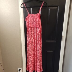 Stylish red floral maxi dress with adjustable straps. Perfect for summer outings. PTP-16.5, L-50