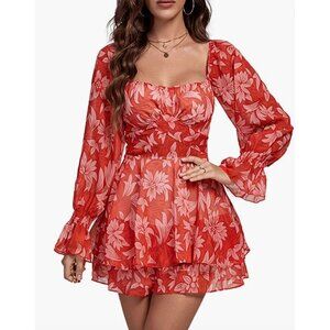Red Floral Printed Chiffon Ruffle Long Sleeve Romper Short Playsuit Jumpsuit