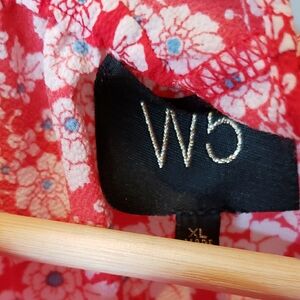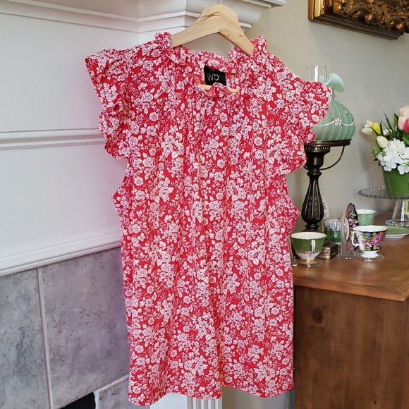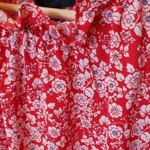 Charming red dress with white floral pattern. Features ruffle details for a feminine touch.