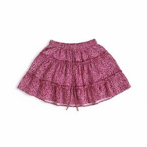 Fun mini skirt with a brick red and white floral pattern. Elastic waistband and a faux tie at the waist.