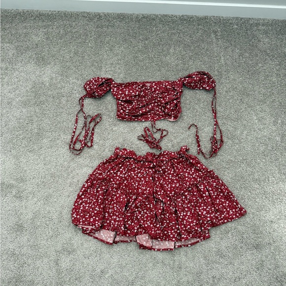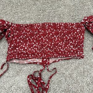 Elegant red top with white floral pattern and ruffled details.
