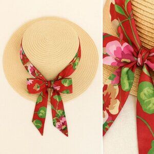 This 100% silk slim scarf in a rich red satin finish features bold floral accents in pink, green, and tan tones. A versatile accessory, it brings vibrant charm to any outfit. Can be worn as neck tie, bag scarf, headband, hat scarf, ponytail bow or wrist wrap.