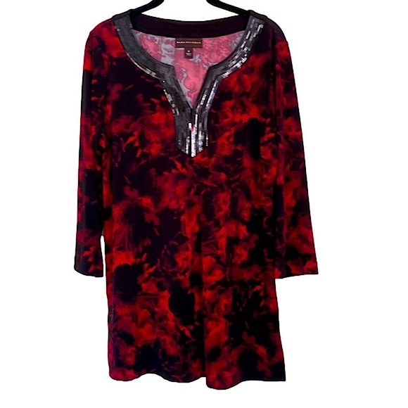 Red Flower Patterned Tunic Top Black Sequined 22” P2P 30” L Collarless Style