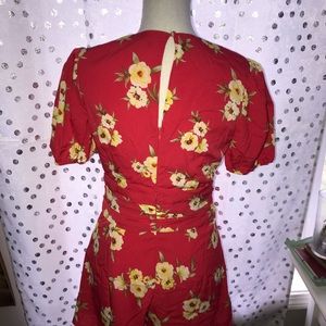 Red flower print romper, worn once, perfect condition. This would make the perfect outfit for a spring or summer day! Lining on inside of shorts.
