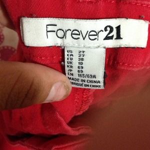 Cute red forever 21 jeans. Fashionable, and comfortable! has a tear under a belt strap but still fit well!