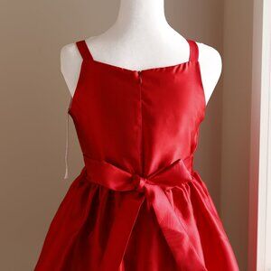 This Girl's size 16 Formal Dress is GORGEOUS! This amazing dress in done in an easy care poly satin/taffeta fabric in a rich, beautiful Ruby Red, that has just the right amount of body without being stiff or floppy. This dress has amazing details. The bodice has Princess seams for a fitted look. The embellished waist is the star of the dress. Double rhinestone rows border the top and bottom. Faux Ruby teardrop jewels are placed side by side in a row and have a double rhinestone border on top and bottom-Just GORGEOUS!! 3/4" shoulder straps add just the right amount of support to hold the top. The skirt gathers at the waist and has a luxurious Bubble Hem- So Sassy and Classy at the same time!! The entire dress is lined in a silver satin fabric (another gorgeous feature). A matching tie-back sash makes for a perfect fit. Zipper back closure. This "Red Carpet" dress is perfect for formal parties, Daddy/Daughter Dances, Flower Girls, Homecoming, Recitals and other Special Occasions. Brand New with Tags!! Beautiful!!