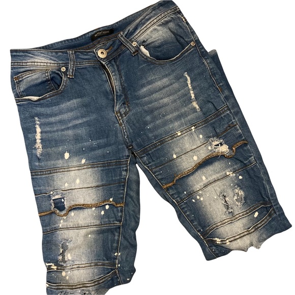 Pre-loved and in good condition, despite the intentional distressing. 98% cotton, 2% spandex