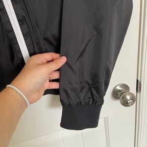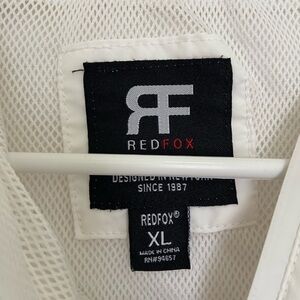Men’s Red Fox windbreaker. Windbreaker is white & dark gray with reflective strip. Has hood with drawstring & front pockets. Full front zips. Size XL. Has very small hole on one sleeve as shown—tried to show from farther away to show size of hole. Smoke free home!