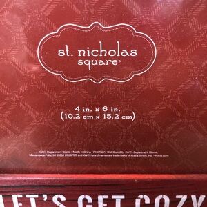 Red frame made to look rustic. Has cute snowman couple with “Let’s Get Cozy”.