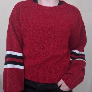 Cute red fuzzy sweater with striped balloon sleeves. Brand is Wild Fable / Target, size small but would fit a medium too.