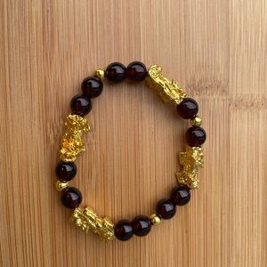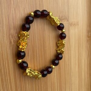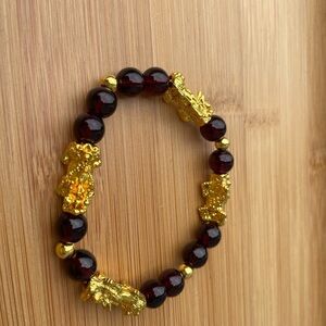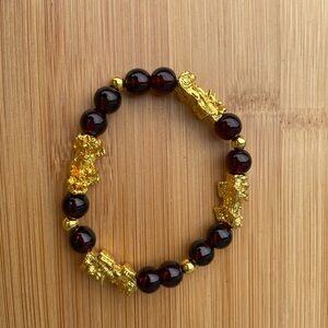 combination of natural stone garnet and alloy Garnet Stone is January birthstone In ancient history, travelers wore garnet because they were believed to light up the night and provide protection from nightmares and accidents. Garnets were used in burial jewelry and carved signet rings to proclaim royalty during the Bronze Age (300 BC). Pixiu with hand engraved sanskit of wisdom and beads. Pixiu can ward off evil spirits and gather blessings. wearing a pixiu bracelet can transform misfortune into luck keeping people happy and healthy bead diameter 12 mm Pixiu size 24.5 x11*9mm/ 30x12x10 mm bracelet length 6.5 -9.5 stretchy handmade imported from China Feng Shui bracelets are for everyone Good for gifts for family or friends wearing a feng shui bracelet can relax moods consolidate wealth and bring good luck to you Feng Shui empahsizes the bracelet should be worn on the left hand with pixiu head facing outward pixiu gathers wealth for the wearer making career progress and family happiness