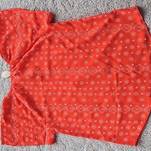 Stylish red blouse with geometric patterns. Features short sleeves and a tie neckline.