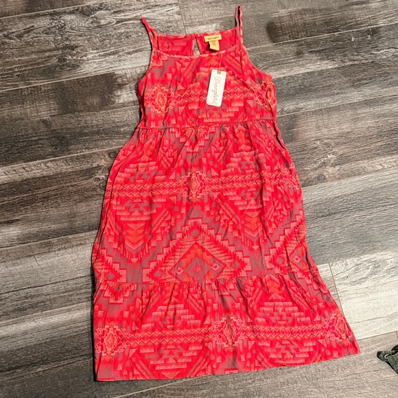Stylish red dress with geometric patterns. Sleeveless design for a chic look.