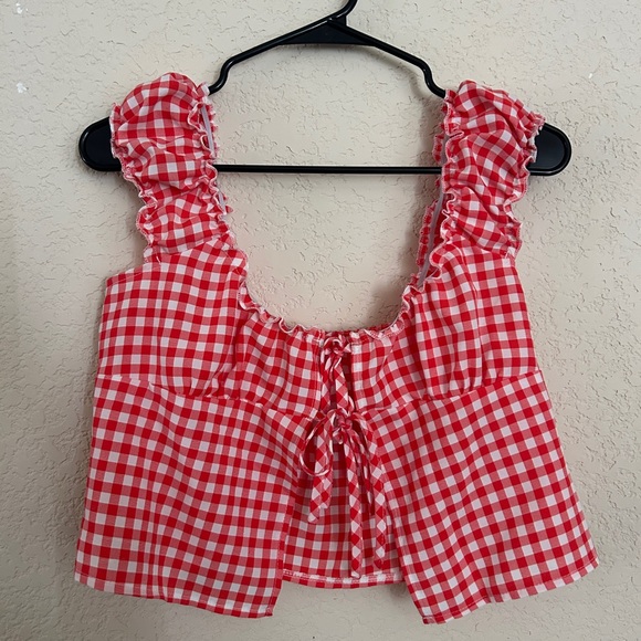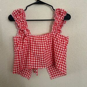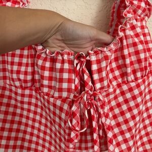 This charming red gingham top features playful ruffles and a flattering fit. Perfect for casual outings or a day in the sun.
