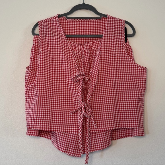 New! Only worn once for video. Chic red gingham sleeveless top with tie front detail. Perfect for casual outings.