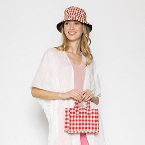This set is so cute! It is red gingham print bag with a matching shoulder strap and bucket hat. The hat is a perfect match for this bag. It has a cute white floral pattern going across it. The bag 100% Polyester, has the dimension 6.25" H x 9" W and 3.25" handles. The shoulder strap drop is 18.5". There is an inside pocket and magnet closure. The hat is 22.8" around.