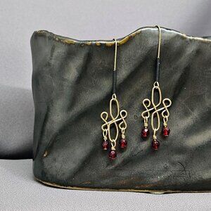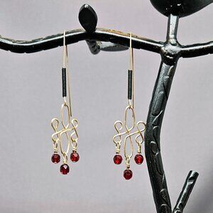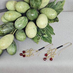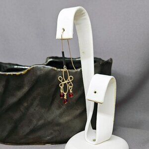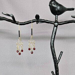 I made these earrings, using three (3) Red Glass Beads, wrapped on 3 14k Gold Filled Headpin. They are dropped from a Wire Wrapped link, using 14k Gold Filled, 20ga Round Wire. Lastly, I used 14k Gold Filled Long Earwires, decorated with a Black spirals.