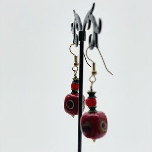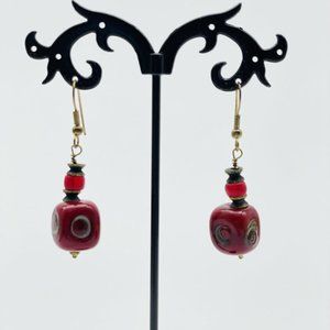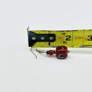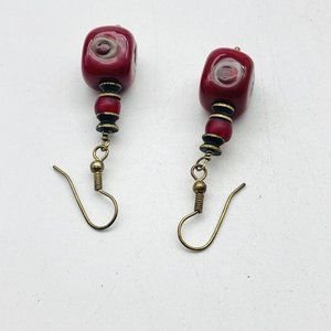 Red Glass Cube Dangle Earrings Brass Tone Boho Festival Party Hippie Artsy