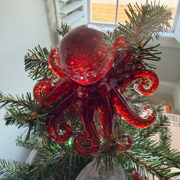 Add a unique touch to your holiday decor with this stunning red glass octopus tree topper. Perfect for creating a festive and whimsical atmosphere.