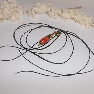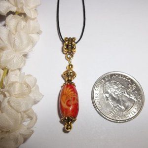This bohemian style beaded necklace set is brand new and handmade by me. Done with a red & yellow wooden bead and antiqued gold toned costume jewelry beads. The pendant measures 1 3/4 inches tall & not quite 3/8 inches wide. The removable charm slides onto a black nylon rope cord 36 inch string. You can tie it to any length you want to wear it!